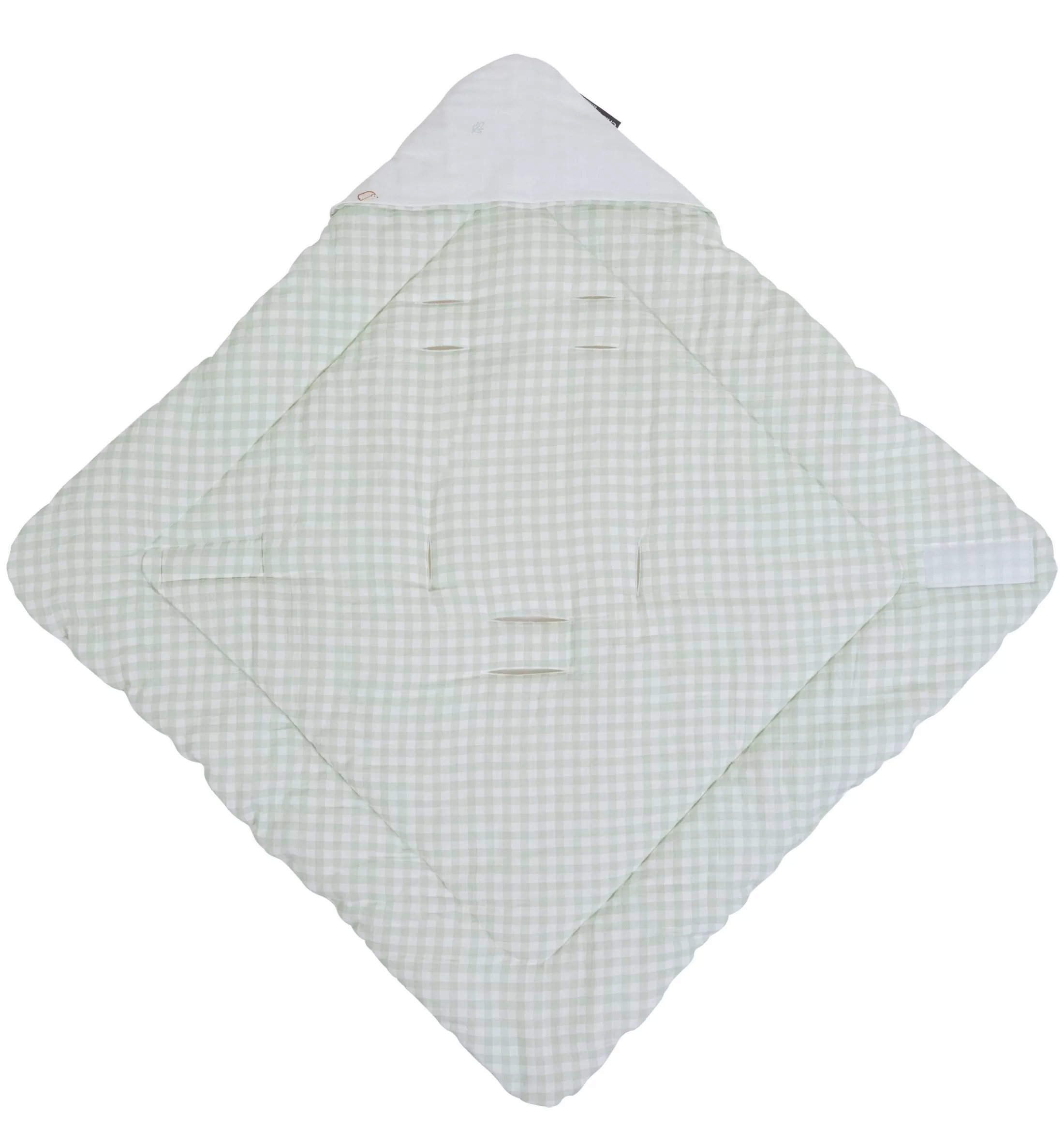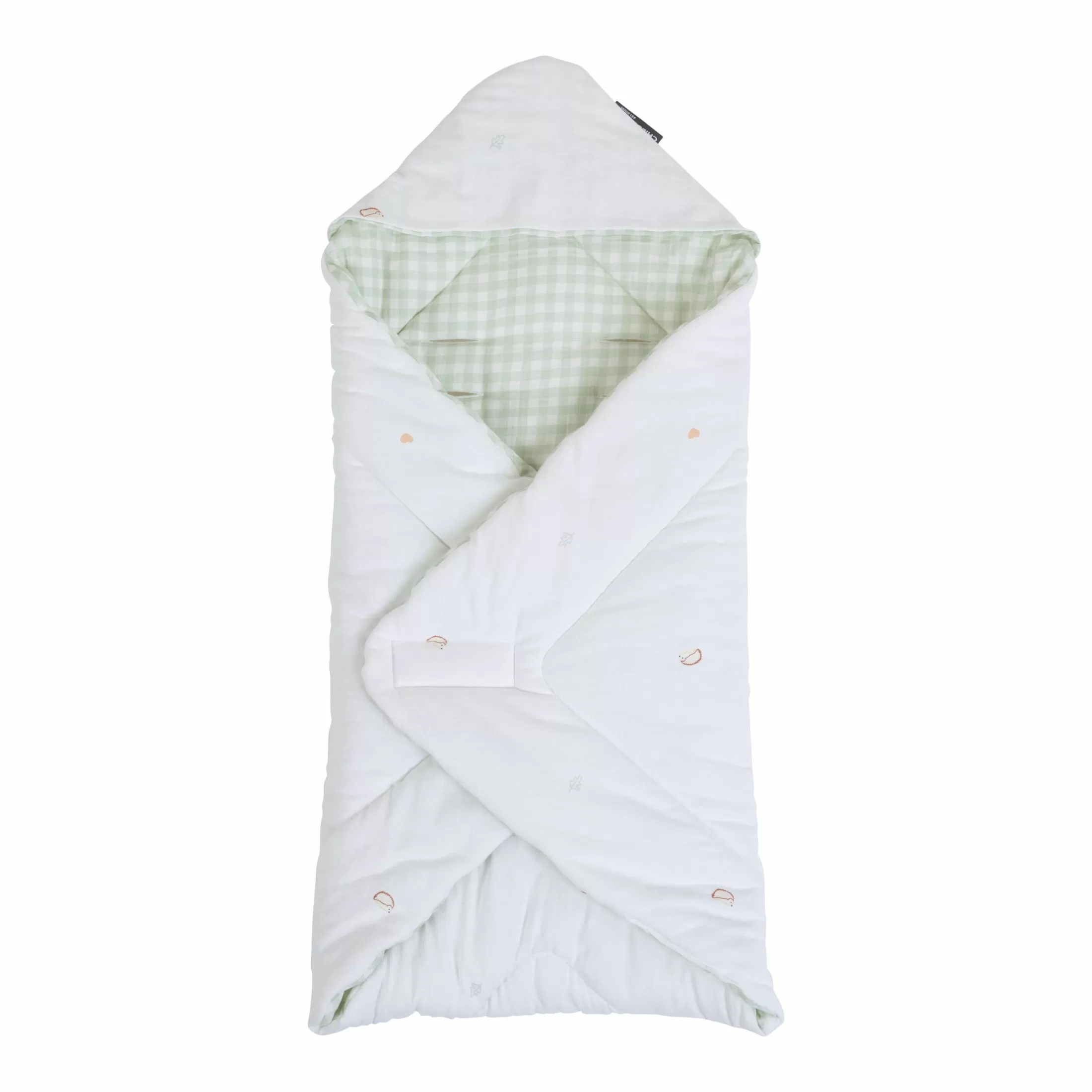 Cette couverture universelle douce avec capuche gardera votre bébé bien au chaud. La couverture en jersey est ornée d’un motif de petites figures mignonnes (un cœur, une feuille et un hérisson) d’un coté et de l’autre d’un vichy vert. Utilisez la couverture pour envelopper confortablement votre bébé dans un transat ou une poussette. Grâce aux ouvertures pour les sangles de sécurité, vous pouvez utiliser la couverture en toute sécurité dans un transat ou un siège-voiture.Atouts importants en un coup d’œil