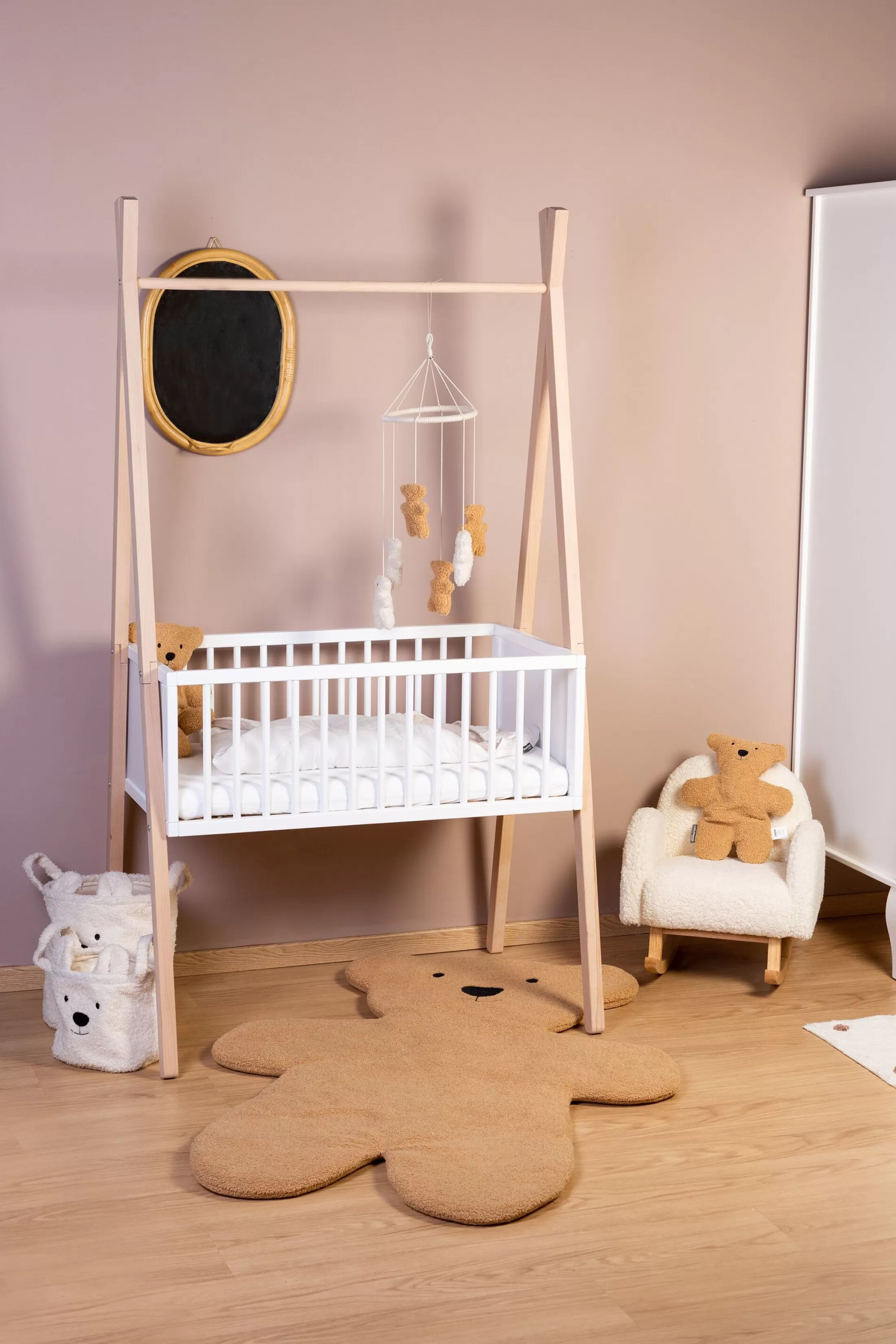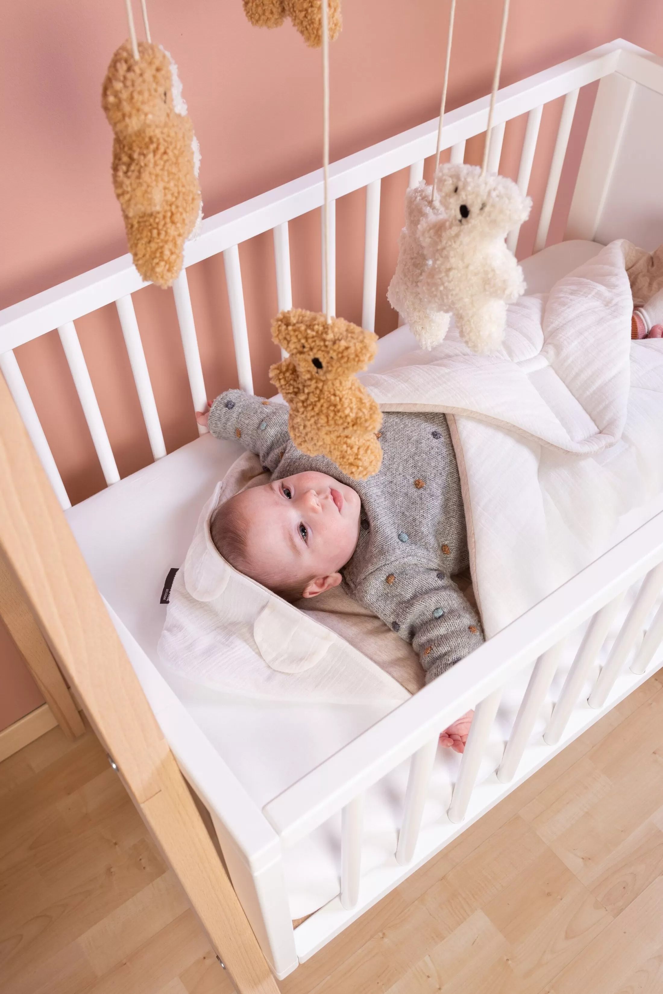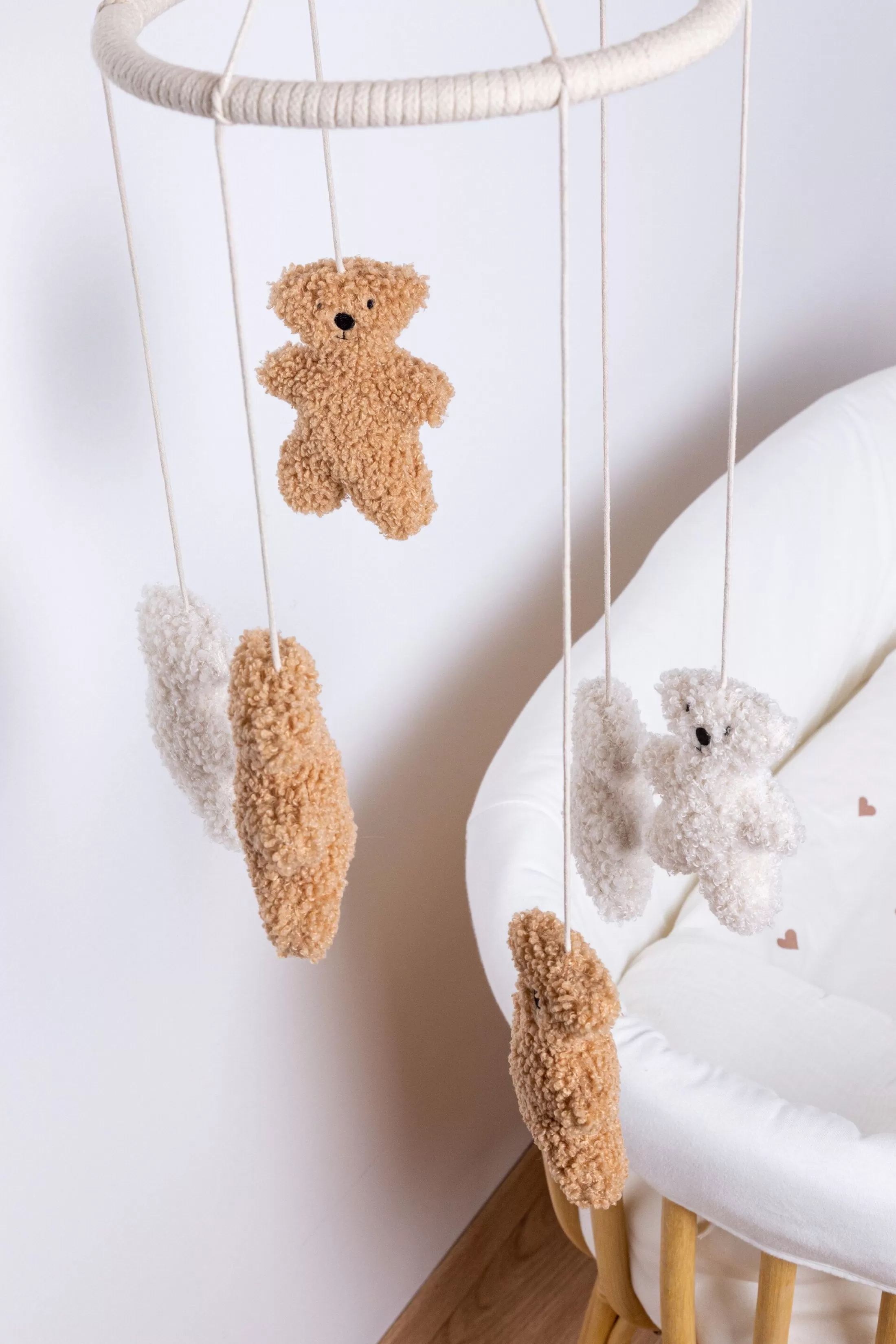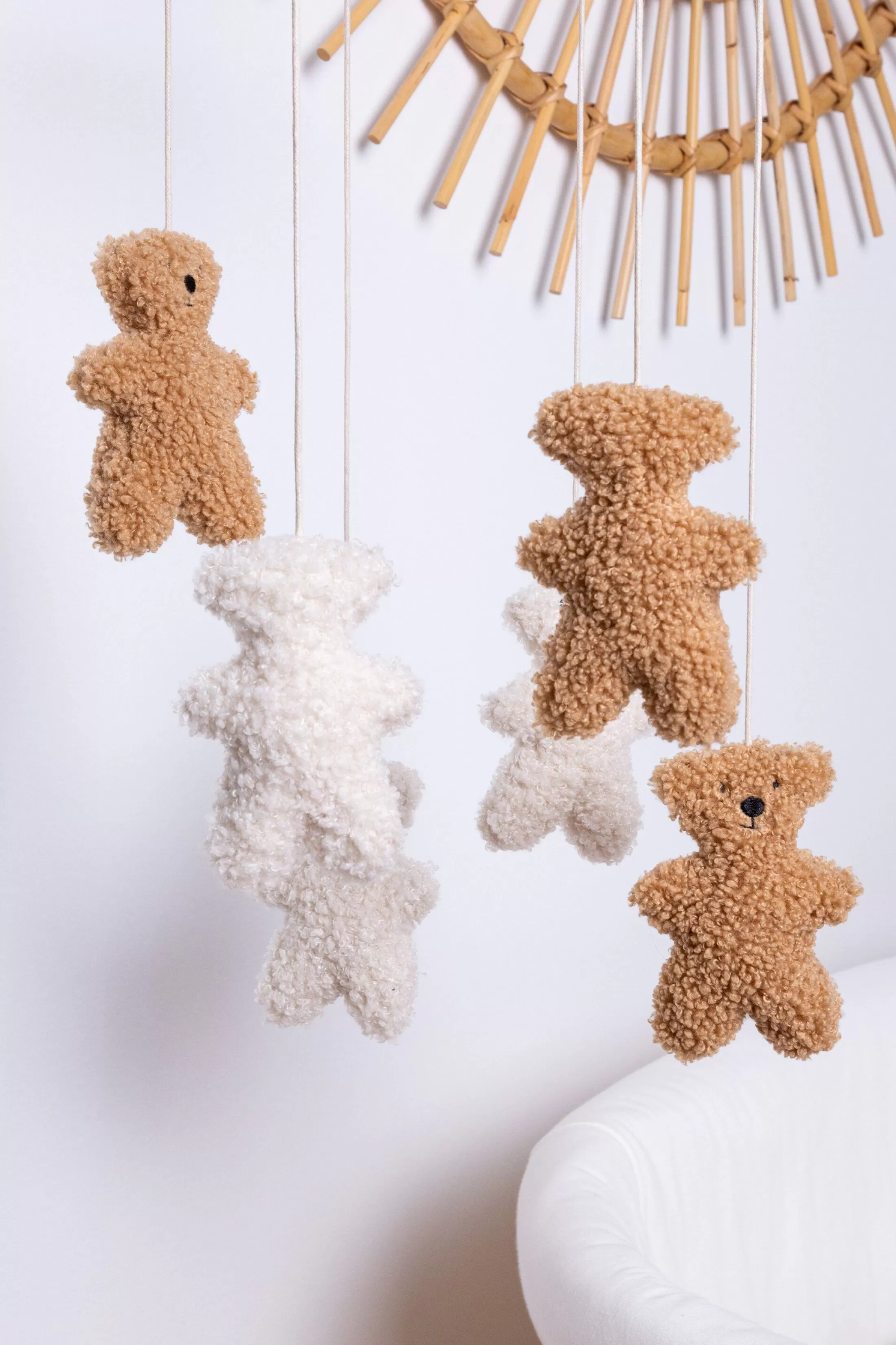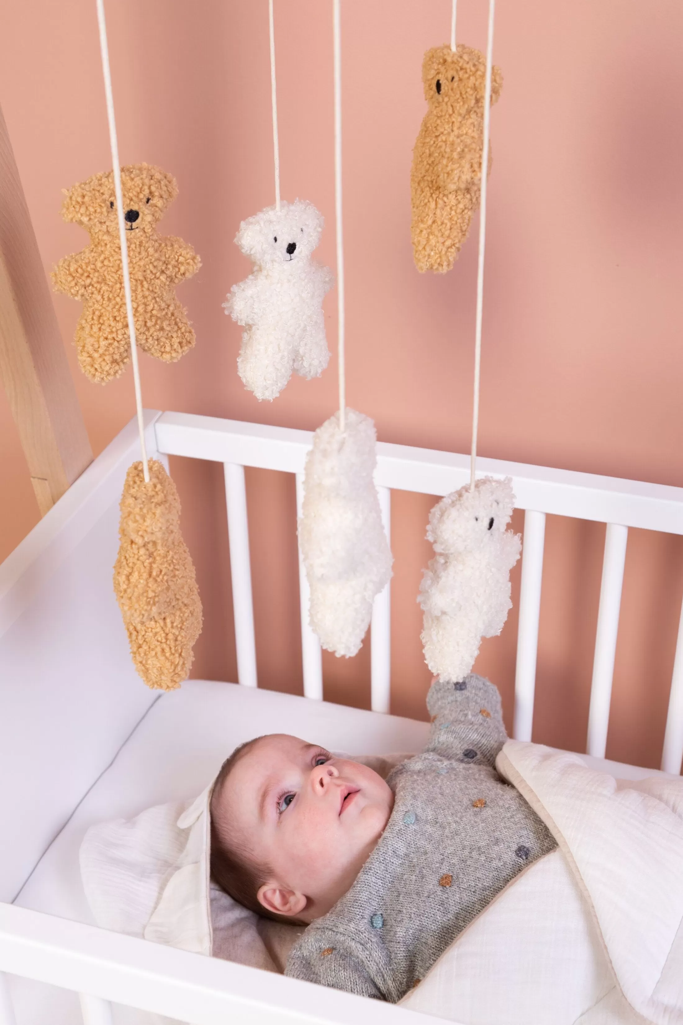 Nos nounours sont maintenant aussi disponibles en mini ! Ce mobile en peluche se compose de 6 adorables personnages en peluche de couleur marron et écru. Votre enfant sera fasciné par ces animaux mignons et s’amusera pendant des heures avec eux. Le mobile est également utile pour stimuler les capacités de mouvement de votre enfant.